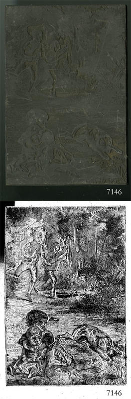 Woodblock for printing an illustration of children outdoors engaged in different activities. |