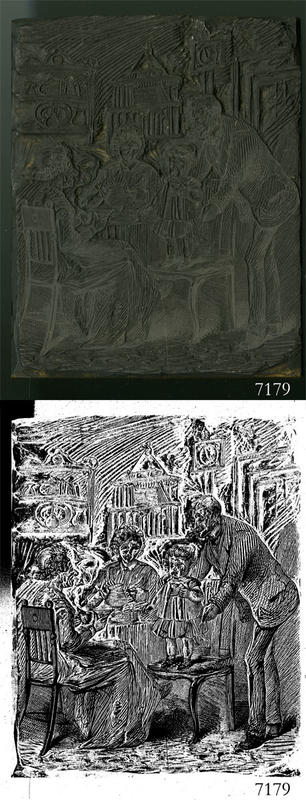 Woodblock for printing an illustration of two women, a man, and a young girl. |