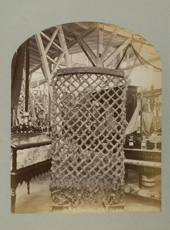 View of "Plante Merveilleuse"--Marvelous Plant--in the Agricultural Hall. Depicts a rope-like tapestry that is actually natural roots. Also shown is an ornate glass display chest, along with a table topped with glass bottles, a model ship, and cloth sacks.