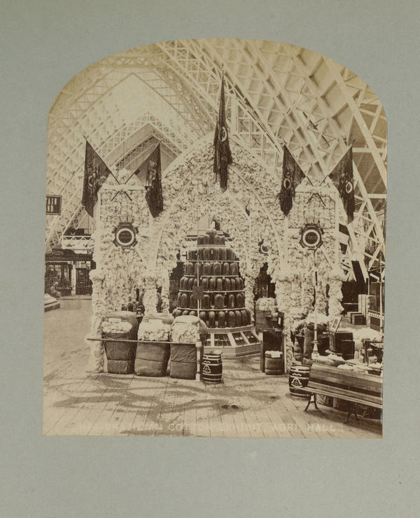 Interior view of the Agricultural Building. Depicts the Brazilian Cotton Exhibit. The cotton is displayed attached to a temporary decorative wall, with flags extending at the top. At the base of the wall are bags of cotton.