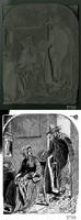 Woodblock for printing an illustration of a man holding a pumpkin toward a woman. |
