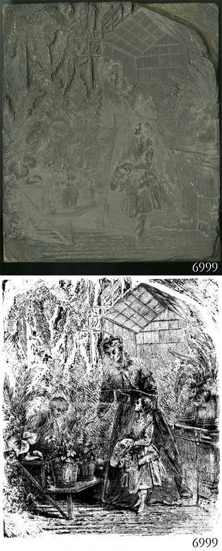 Woodblock for printing an image of a woman and two children in a greenhouse. |