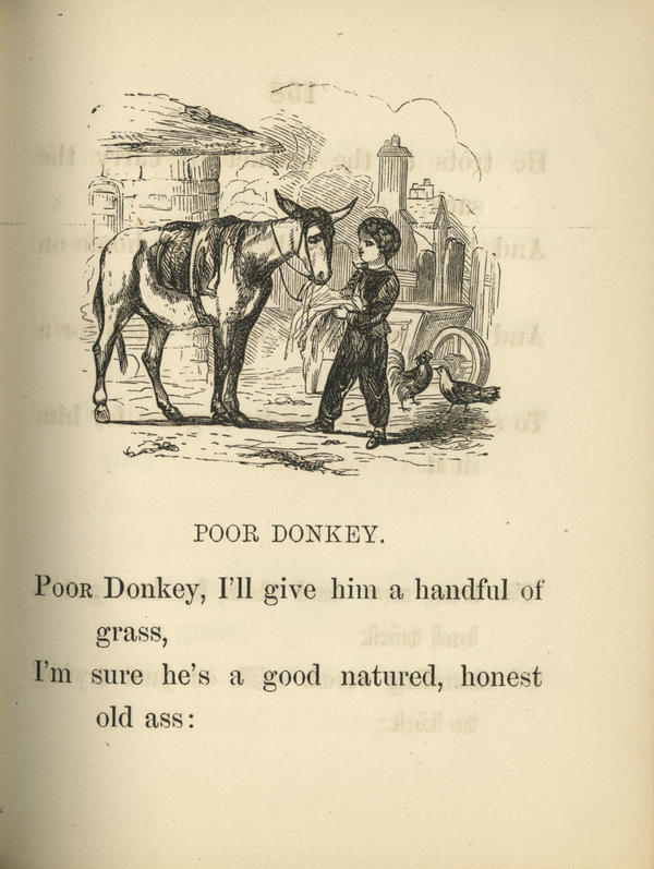 “Nursery Rhymes. Poor Donkey – – p. 135.” – Inscribed on side of block.