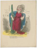 A woman wearing a cloak and bonnet holds at lamppost for support. Her mouth is open and she appears drunk. A sign on the wall behind her says "Gin." The Valentine faults her for her drunkenness.