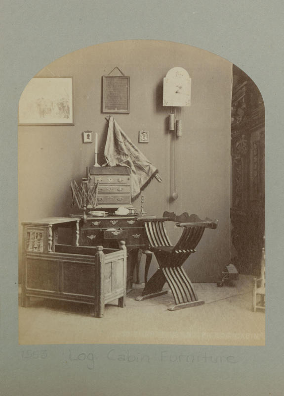 Exhibit of log cabin furniture showing a crib, chair, and desk with a clock, framed prints, two silhouettes, and a banner