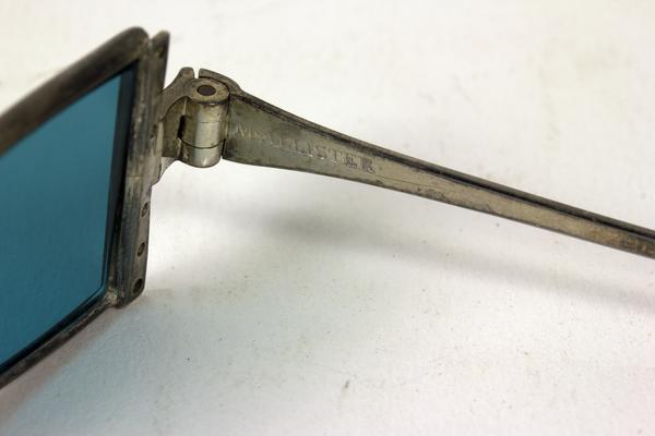 D-horseshoe spectacles with blue-tinted lenses. Marked with "McAllister" and a flower with pivot-style temples. The flower mark was commonly used as a journeymen's mark.
