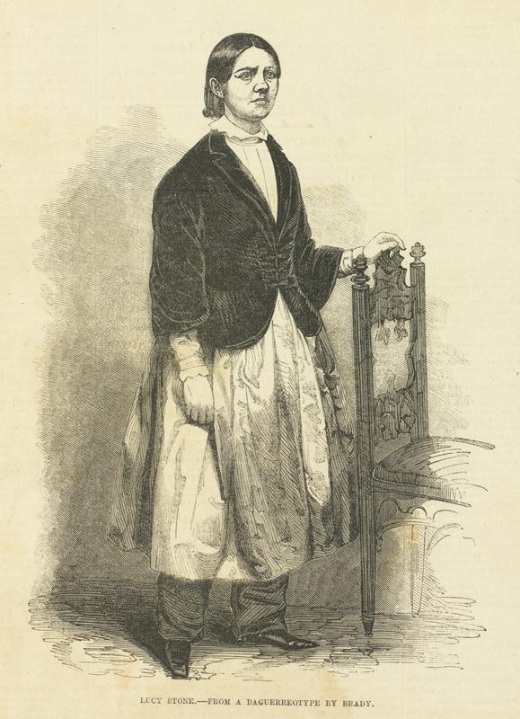 Full-length portrait of the suffragist Lucy Stone, wearing bloomers. |