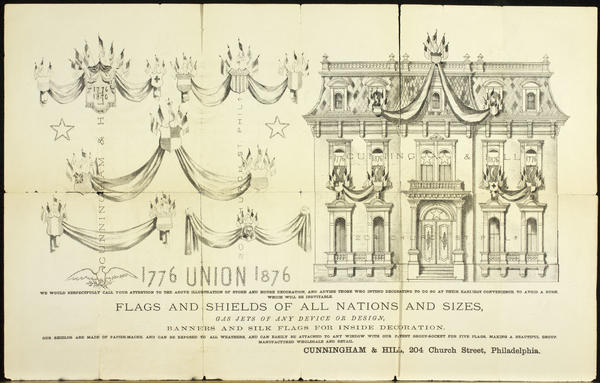 Advertisement issued during the Centennial Exhibition 1876 for the upholstery manufacturers and dealers containing illustrations of 5 different styles of patriotic bunting and an exterior view of a residence adorned with bunting and commemorative window shades. Illustrations depict bunting designs composed of shields, flags (including America, France, Great Britain), swaths of fabric, panels, and fringes. One design includes shield with portrait of George Washington. Section of advertisement also includes a design for lettering reading "1776 Union 1876" complemented by the figure of an eagle. View of residence shows a three-story mansard-roofed building with a portico entrance. The name and address of Cunningham & Hill are printed over and within the illustrations. Cunningham & Hill, the partnership between William B. Cunningham & Philip Hill, operated between circa 1871 and 1876 when the partnership dissolved.