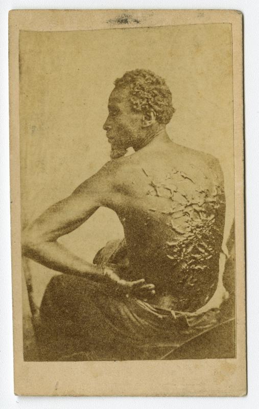 Three-quarter length portrait showing the severely scarred back of the former enslaved and Union soldier, Peter, also known
