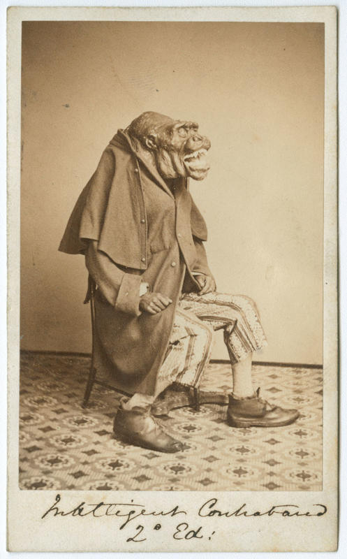 Racist photograph showing a seated African American man, attired in a gorilla mask, a coat, striped, patterned pants, socks, and shoes, facing right. Also included in the image is a patterned, tile floor.