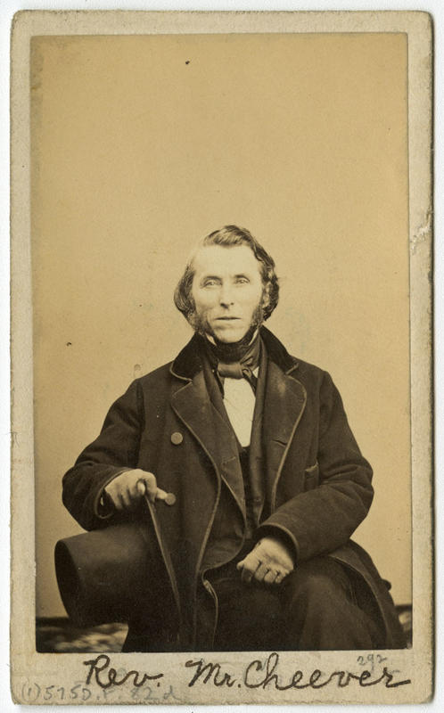 Three-quarter length portrait of the abolitionist preacher and author. Cheever, attired in a white collared shirt, a black tie, waistcoat, jacket, overcoat, and pants, holds a top hat in his gloved hands as he sits facing the viewer. Cheever's book, "The Guilt of Slavery and the Crime of Slaveholding: Demonstrated from the Greek and Hebrew Scriptures," argued that the Bible categorically denounces slavery.