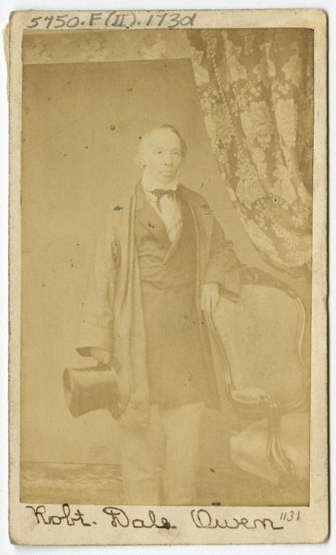 Full-length portrait of the social reformer, Indiana Congressman, and Chair of the American Freedmen's Inquiry Commission. Owen, attired in a white collared shirt, a bowtie, a jacket, an overcoat, and pants, stands holding a top hat in his right hand beside a chair, near a drape. Owen's work for the commission has been credited as the impetus for the establishment of the Freedmen's Bureau during Reconstruction.