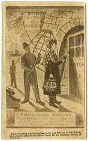 Cartoon satirizing the imprisonment at Fort Monroe, Va. of Confederate president Jefferson Davis, detained by Union cavalry troops on May 10, 1865, while wearing his wife's overcoat and shawl as a disguise. Shows an African American soldier escorting Davis to a cell door at the "Hotel De Monroe." In front of the door a noose hangs. Davis, attired in a bonnet, shawl, and overcoat, holds a money bag labeled "JD. CSA" (an allusion to Davis's confiscation of the remaining Confederate treasury). The soldier holds a bayonet to which a skirt hoop is attached and speaks in the vernacular "Hi dar! Show dis ole lady a room..." In the background, a smiling sun, an African American soldier, and a ship sailing the bay are visible. Davis was imprisoned at Fort Monroe between 1865 and 1867.