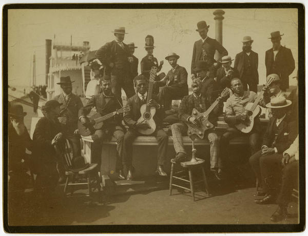 Scene depicting a group of four African American men singing and playing guitars while surrounded by spectators, seated on the deck of a riverboat, possibly in Tennessee. The musicians sit on a raised platform with their feet dangling. The third performer to the right plays a star shaped guitar and sings with his head tilted back and mouth wide open. He props his right foot on a stool. In the right, two African American men sit in wooden chairs. Surrounding the musicians, white men, women, and children sit and stand and look on. In the background, people walk on the deck and the smokestacks are visible.
