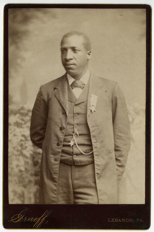 Three-quarter length portrait of an African American man standing with his hands behind his back facing slightly left. He is attired in a white collared shirt, a bowtie, a waistcoat, a jacket, and pants. His jacket is adorned with a ribbon on his lapel, and there is a watch chain on his waistcoat, both decorated with metal stars, possibly signifying his membership within a fraternal lodge.