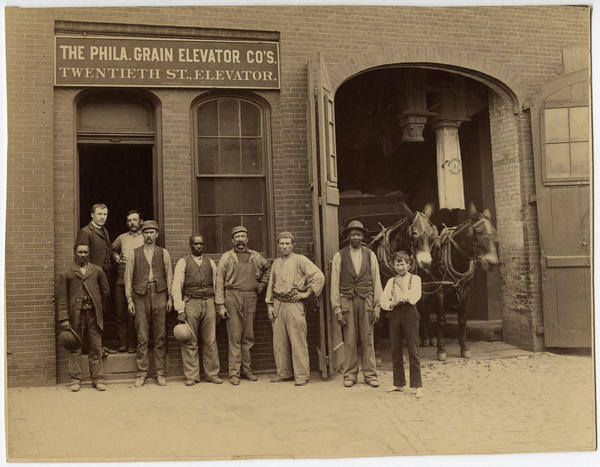 Avenue in Philadelphia, Pa. posed before the grain storage facility. In the left, two white men employees stand in an open