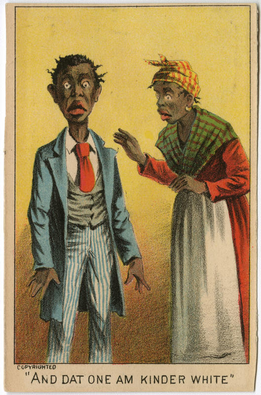 in his pockets while "Aunty" smiles; "And Dat One Am kinder White" showing the man aghast and standing straight up as "Aunty"