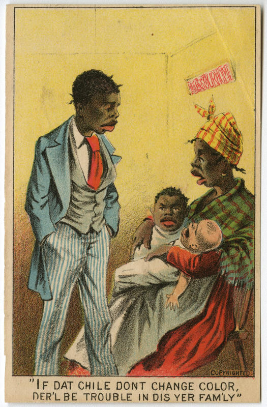 Set of four collecting cards depicting racist caricatures of African Americans to satirize fatherhood and the question of