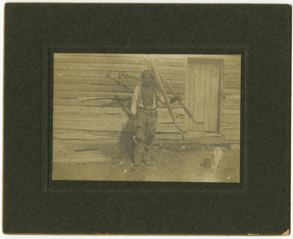 Full-length portrait of an African American man, attired in a brimmed hat, a long-sleeved shirt, and pants with large tears and holes, holding a wooden plow over his shoulder. He stands in front of a wooden building and to the left of a wooden door. In the right is a white dog with its back to the viewer.