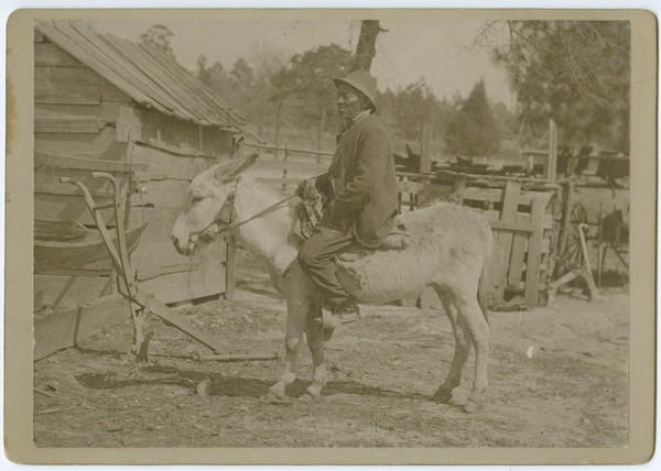 Depicts an older African American man, possibly a sharecropper, sitting on a donkey. The man has gray hair and stubble and is attired in a hat, and a torn and worn collared coat, pants, and shoes. He sits on a worn saddle and hold the reins to the donkey. Within the fenced in farmyard is a shed made from planks of board, a plow, and more farming equipment. Trees are visible in the background.