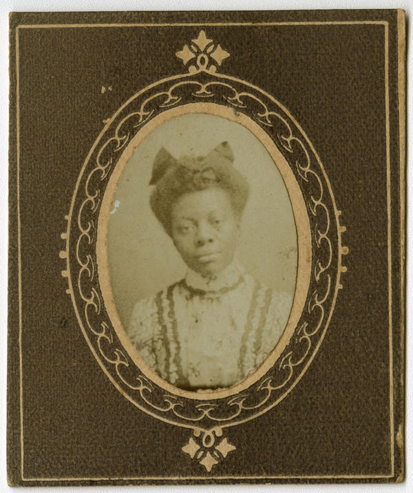 Bust-length portrait of a young unidentified African American woman. The woman, wearing her hair tied and decorated with a bow at the back of her head and attired in a long-sleeved dress in a patterned fabric with a high collar, looks directly at the viewer.