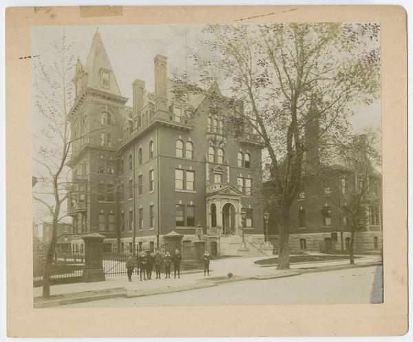 View of the exterior of the administration building at Thirty-ninth Street between Powelton Avenue and Filbert Street in West Philadelphia, erected in 1891 and demolished in 1959. Shows the stairs leading to the front door to the brick building. In the left, a row of seven boys, including an African American boy, stand on the sidewalk before a gate and look at the viewer. Trees line the sidewalk. The three-story building in the right is visible. Built on land donated in 1871 by church member Rev. Dr. Ephraim D. Sanders, the hospital was erected as a monument to the Philadelphia Presbyterian Alliance which was formed in 1870 following the reconciliation of the Old and New School Branches of the Presbyterian Church.