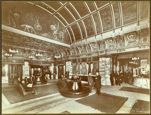 Interior view of the ornate lobby of the Hotel Walton located at Broad and Locust Streets, Philadelphia, Pa. The lobby, decorated with ornamental plaster moldings, marbles, and two mural paintings, is furnished with leather chairs and benches. Shows white men hotel guests who sit, read, converse together, and stand at the desks. Hotel staff stand behind the desks, and two African American men hotel porters wait in the right. Designed by Angus S. Wade, the hotel (formerly part of the Hotel Metropole building), was completed in 1895 and considered one of the most elegant in the city with its multiple dining rooms, reception rooms, and salons.