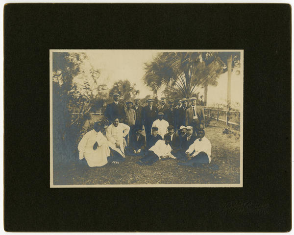 Group portrait of the politicians, including state senator James McNichol, Pennsylvania Judge Thomas Knight Finletter, and state senator Edwin Vare, posed outside with members of the estate's staff, including African American men. A row of nine white men stand behind a seated a row of men, including two African American men attired in white collared shirts, black bow ties, white jackets, and dark-colored pants, and three men, attired in chef’s uniforms and aprons, consisting of one white man and two African American men. The group is in a fenced in area with palm trees in the background.