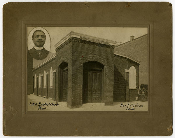 Exterior view of the African American church on South Sartain Street, Philadelphia. Shows the front entrance to the brick building with shuttered windows. View includes portrait inset depicting the Rev. T.P. Wilson wearing a mustache and goatee and attired in a clerical collar and a jacket. Eden Baptist Church was founded in 1894.