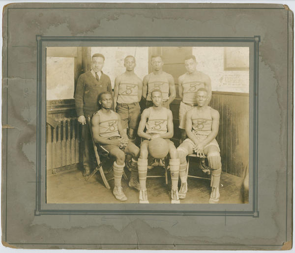 Group portrait photograph depicting members of an African American basketball team with their coach, probably in Philadelphia. Three players sit on wooden chairs, the middle one with a basketball on his lap. Behind them, the coach and three more players stand and look at the viewer. The athletes are attired in uniforms consisting of a sleeveless shirt with a logo on the front, shorts, knee-length socks, and shoes. Posters for good health and African American participation in athletics hang on the walls, possibly of a Boys' Club or YMCA.
