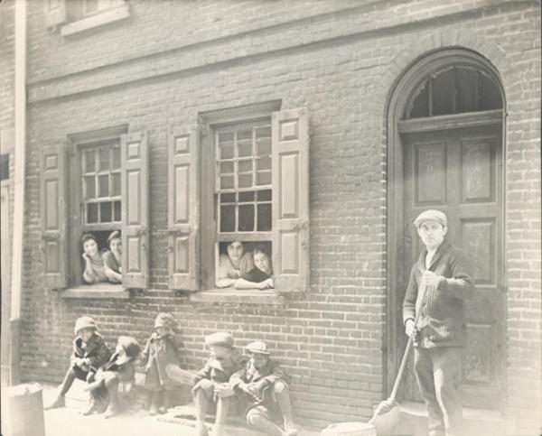 Exterior view of depicting the entrance of a Jewish family’s brick house north of Arch Street in Philadelphia. In the right,