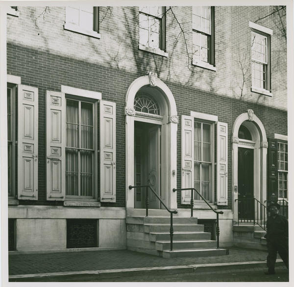 Exterior view of one of the Victorian style row houses built on the 1800 block of Delancey to accommodate the growing number of the Philadelphia elite moving west in the mid-19th century. The house, designed by an unknown architect, was built in 1853 for Mrs. Alexander H. Scott. An African American man pedestrian walks on the sidewalk in the right and looks at the viewer.