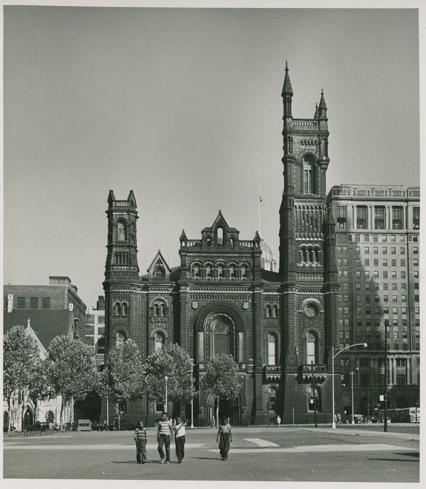 View showing the front facade of the temple on 1 North Broad Street, designed by Freemason and Philadelphia architect, James H. Windrim, completed in 1874. Built to accommodate the local lodges increasing membership, the temple has been called the grandest in the country. Four African American boys walk in a lot in the foreground towards the viewer. Pedestrians walking on the sidewalks are visible in the background.