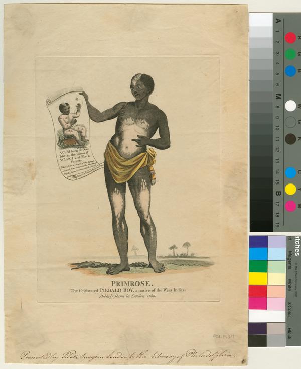 Primrose [graphic] : The celebrated piebald boy, a native of the West Indies; publicly [sic] shewn in London 1789. |