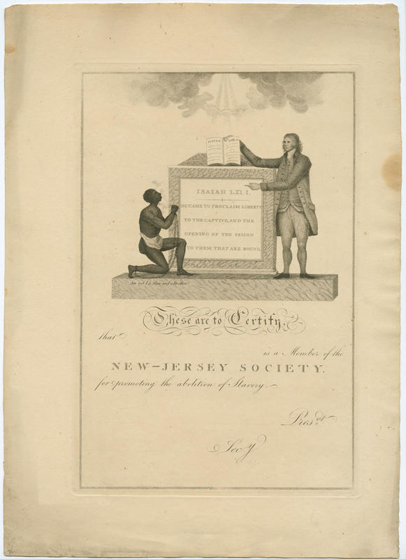 These are to certify, that [blank] is a member of the New-Jersey Society, for promoting the abolition of slavery. [blank] Presdt. Secy. [blank] [graphic].
