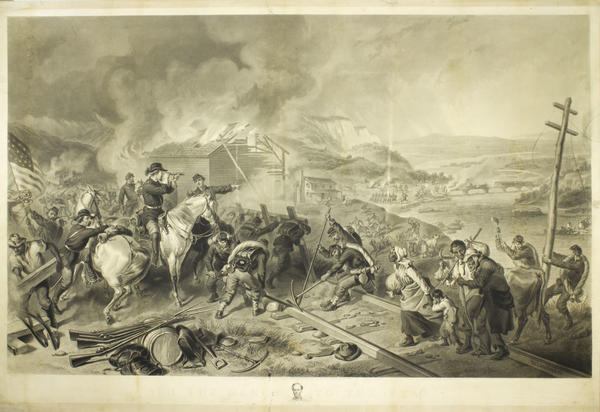 In the background, Union soldiers round up cattle, burn homesteads and a bridge, and fire upon retreating Confederate soldiers.