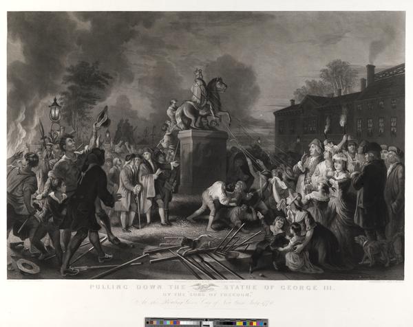 Print commemorating American independence after the painting by religious and historical artist, Johannes A. Oertelat, at the New York Historical Society. Depicts white men attempting to topple the equestrian statue of King George following the reading of the Declaration of Independence at the foot of Broadway. At the base, men pull on ropes wrapped around the sculpture while men from behind use rods to knock it over. In front of the pedestal, an African American man has fallen over on the ground. An excited crowd of spectators, including well-to-do and working class men, women, and children cheer, point, hold torches and mallets, and trample upon the broken fence once surrounding the statue. In the left is a Native American man attired in a feather headdress and carrying a spear. Several dogs run in the foreground. In the background, ships in New York harbor are visible.