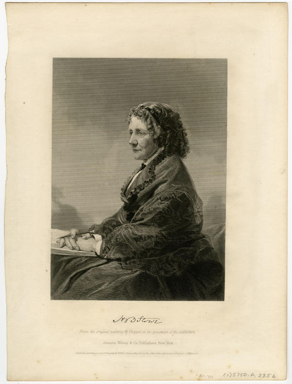 Three-quarter length, left profile portrait of the abolitionist and author of "Uncle Tom's Cabin." Stowe, wearing her hair