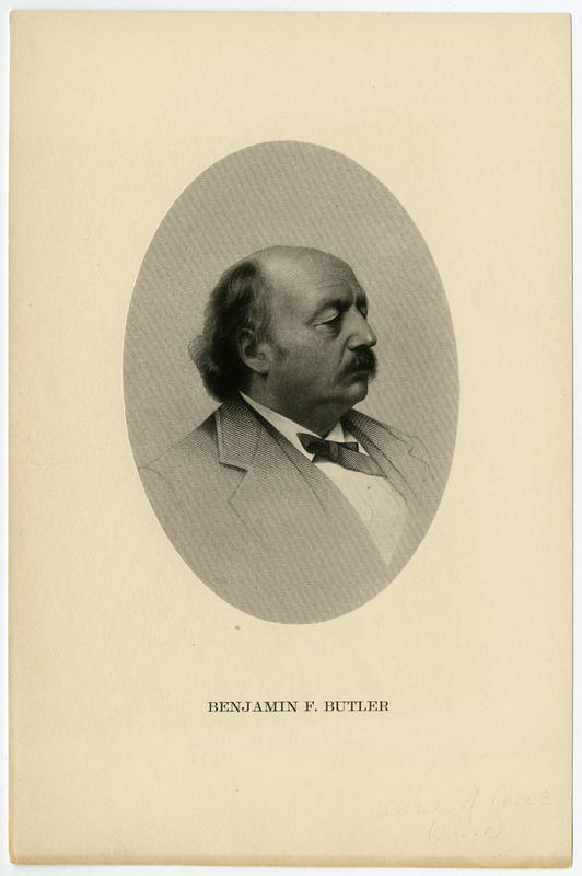 Right profile, bust-length portrait of the Massachusetts governor, abolitionist legislator, and Civil War Major General. Butler wears a mustache and is attired in a white collared shirt, a bowtie, a waistcoat, and a jacket. Butler, while commander of Fort Monroe, Virginia declared freedom seekers as "contraband of war," providing the impetus for Congress to enact the Confiscation Act of 1861.