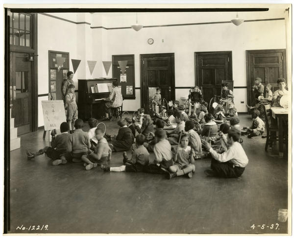 Depicts the young students, including African American children, from the Willis and Elizabeth Martin Orthopedic School playing simple percussion instruments during a music lesson of the "Shoemakers Dance." In the left at the front of the classroom, a boy student acts as conductor, overseen by the teacher and woman piano accompanist. The students sit on the floor with their instruments. Along the wall are several students in wheelchairs. Opened in 1936, the Public Works Administration funded school, named after the Philadelphia judge and health care reformer and his philanthropist wife, provided the students with medical care and a curriculum of humanities, arts, crafts, and drama.