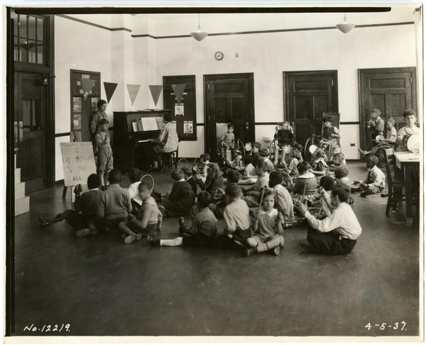 Depicts the young students, including African American children, from the Willis and Elizabeth Martin Orthopedic School playing simple percussion instruments during a music lesson of the "Shoemakers Dance." In the left at the front of the classroom, a boy student acts as conductor, overseen by the teacher and woman piano accompanist. The students sit on the floor with their instruments. Along the wall are several students in wheelchairs. Opened in 1936, the Public Works Administration funded school, named after the Philadelphia judge and health care reformer and his philanthropist wife, provided the students with medical care and a curriculum of humanities, arts, crafts, and drama.