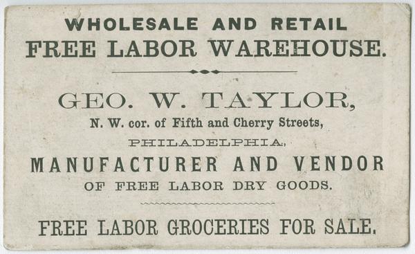 Business card with printed type for the member of the Philadelphia Free Produce Association of Friends. Taylor, a Quaker, operated a textile mill that used only non-enslaved cotton as part of the Free Labor Movement. The movement active from the 1790s to the end of the Civil War advocated the boycott of goods produced by enslaved labor.