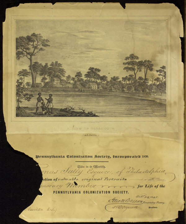 Honorary life membership certificate containing a view of Liberia, the African American colony established by the American