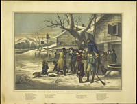 Genre scene depicting a turkey shoot on a snowy knoll near a New England barn and tavern. In the foreground, a group of white