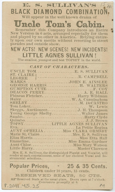 Promotional text printed on verso for Uncle Tom's Cabin includes cast of characters and seat prices.