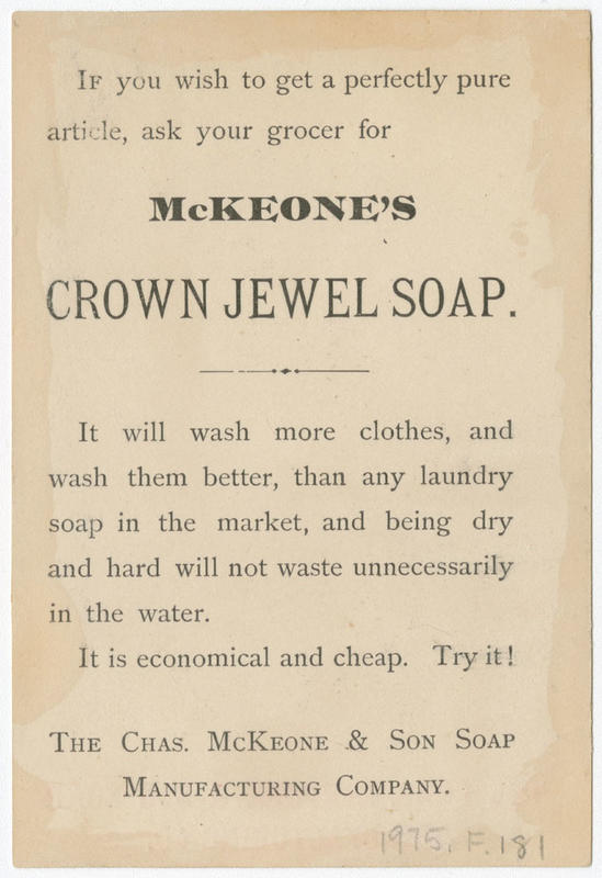 Advertising text promoting McKeone's "Crown Jewel Soap" and "Kalistine concentrated extract of soap" printed on versos. |