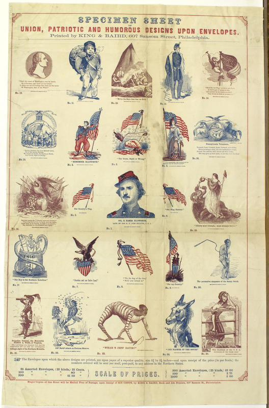 Advertisement containing twenty-five examples of Civil War envelope vignettes published by King & Baird. Majority of the vignettes