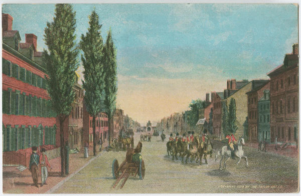 Founder's Week postcards commemorating the 225th anniversary of the founding of Philadelphia. Copies of William Birch's engraved view of High (Market) Street from Ninth depicting a detachment of the First City Troop of Philadelphia drilling on horseback. The troop promenades up the busy street where several horse-drawn carts and a dray travel and several pedestrians, including an African American man and boy (in the right), watch the guard and/or stroll the tree-lined sidewalks. A market shed is seen in the distance. The First City Troop, one of the oldest continually mounted U.S. military units, was organized in 1774 to defend against British invasion. The troop used a variety of arenas to perform drills including circuses, riding schools, and various public grounds. Founder’s Week celebrated the 225th anniversary of the founding of Philadelphia, October 4-10, 1908. There were numerous parades and activities with each day having a special designation, including Religious, Military, Municipal, Industrial, Children’s and Naval, Historical, and Athletic and Knights Templar Day.