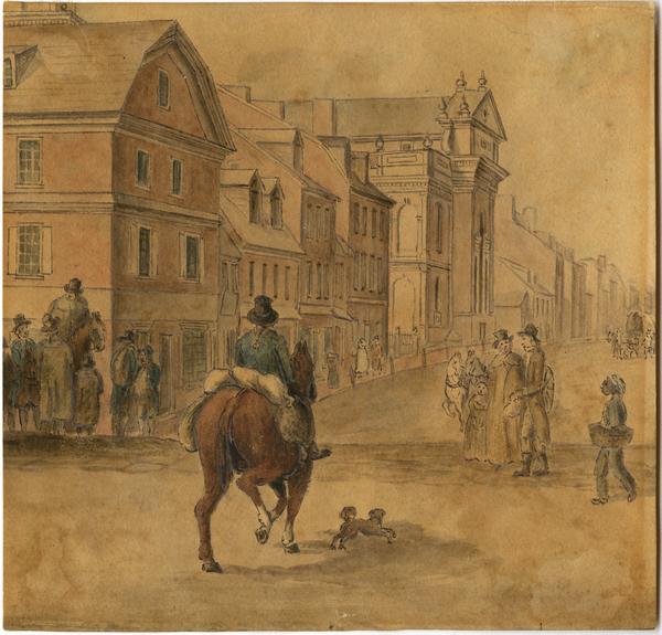 Artist's study of a street scene showing Second Street north from Market Street with a view of Christ Church. Depicts a man