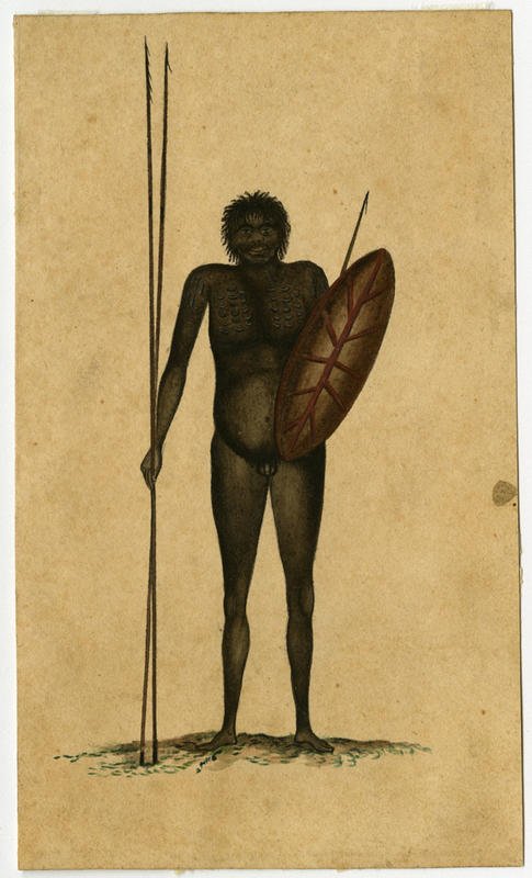 Ethnographic-style full-length portrait depicting an Aboriginal Australian man. He stands naked and holds a shield and spears. His chest and upper arms are adorned with body modifications in the form of scars.
